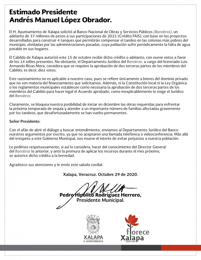 Xalapa, Ver. (AVC/Perla Sandoval) El director jurídico del Banco Nacional de Obras y Servicios Público (Banobras), Luis Armando Rivas Mora, se negó a aceptar la solicitud del Cabildo de Xalapa para acceder a un adelanto de 37 millones de pesos a sus participaciones de 2021 para la construcción de cuatro tanques de agua. El presidente municipal de Xalapa, Hipólito Rodríguez Herrero, solicitó la intervención del presidente de la República, Andrés Manuel López Obrador, ante la determinación de Banobras de no admitir la solicitud argumentando que fue avalada por nueve de los 10 ediles que dijo se requerían para hacer la solicitud. En la carta enviada al presidente de la República advirtió que este requisito no puede aplicarse al Ayuntamiento de Xalapa porque este aplica cuando se trata de bienes de dominio privado, lo cual no es el caso. “El Cabildo de Xalapa autorizó este 15 de octubre recibir dicho crédito o adelantó con 9 votos a favor de los 14 ediles presentes no obstante el departamento jurídico de Banobras, a cargo del licenciado Luis Armando Rivas Mora, considera que se requiere la aprobación de dos terceras partes de los miembros del cabildo es decir 10 votos, este razonamiento no es aplicable a nuestro caso pues se refiere únicamente a bienes de dominio privado que no son materia del financiamiento que solicitamos”. El alcalde recordó que estos proyectos de construcción de cuatro tanques permitirían compensar el tandeo en las colonias más pobres del municipio que dijo han sido olvidadas por las administraciones pasadas cuya población sufre periódicamente la falta de agua potable en sus hogares. Por ello, el alcalde señaló que ni la Constitución local y la Ley Orgánica o los reglamentos municipales establecen como necesaria la aprobación de dos terceras partes de los miembros del cabildo para hacer legal el acuerdo aprobado. “Como inexplicablemente lo exige el jurídico el Banobras, si claramente se bloquea nuestra posibilidad de iniciar en diciembre las obras requeridas para enfrentar la próxima temporada de sequía y atender a un importante número de familias afectadas gravemente por los tandeos que desafortunadamente se han vuelto permanentes”. Incluso, dijo que con el afán de abrir el diálogo y buscar entendimiento enviamos al departamento jurídico del banco los argumentos por escrito ya que no aceptaron una llamada telefónica o videoconferencia. “Más allá del irrespeto a este gobierno municipal nos mueve el interés evitar prejuicios a nuestra población, le pedimos respetuosamente si así lo considera hacer del conocimiento del director general de Banobras lo anterior y ante la premura de aplicar los recursos durante el mes próximo se autorice dicho crédito a la brevedad”.