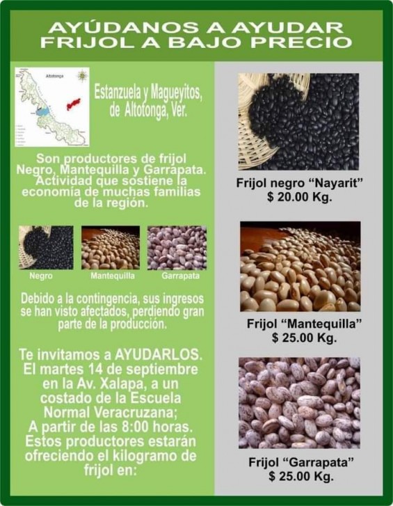 “Antes de que se pudra, o se eche a perder mejor lo trajimos a vender, barato, si está barato porque el precio es directo de productor al consumidor y sin intermediarios. Le damos de a 20 pesos el kilogramo de frijol negro y 25 pesos el kilo de frijol mantequilla” dijo uno de los hombres del campo, que de paso anunció que el próximo martes 21 de septiembre regresarán a vender en el mismo lugar y a la misma hora.