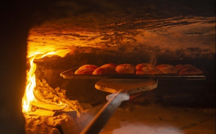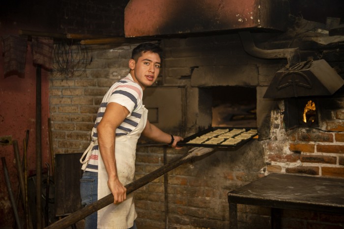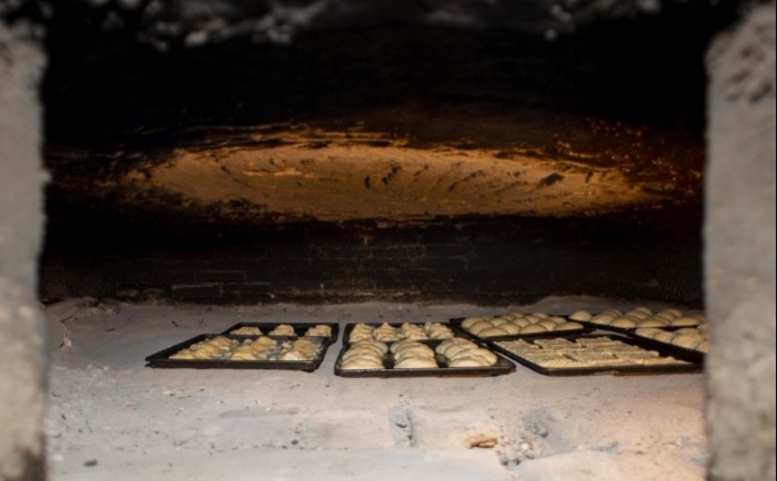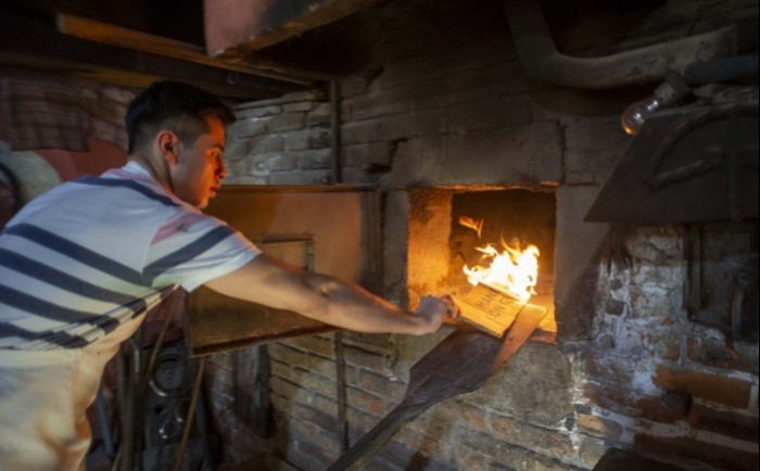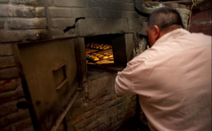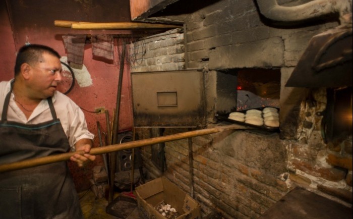 Martín Cortés, otro hijo de Don Toño, nos muestra como funciona el horno y explica el momento exacto en que está listo para recibir las charolas con las piezas de pan, que no deben permanecer en el interior más de diez minutos.