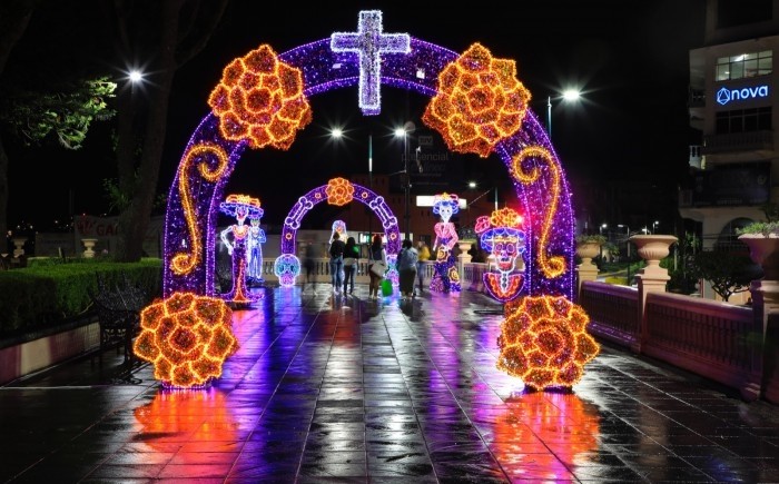 Para celebrar una de las más arraigadas tradiciones mexicanas, la fachada del Palacio Municipal y el pasillo principal del parque Benito Juárez lucen ya adornos e iluminación alusiva al Día de Muertos.