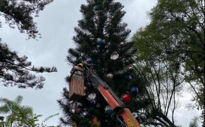 El ayuntamiento local prestó una camioneta con grúa para que un empleado de la dirección de Alumbrado Público colocara las esferas en la araucaria que está frente al palacio municipal a unos metros de la calle Enríquez.