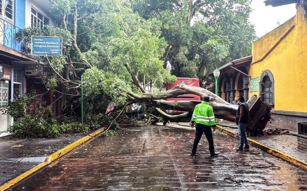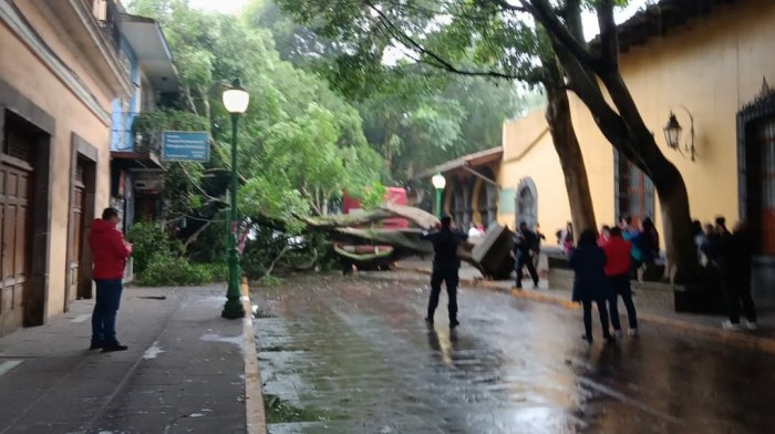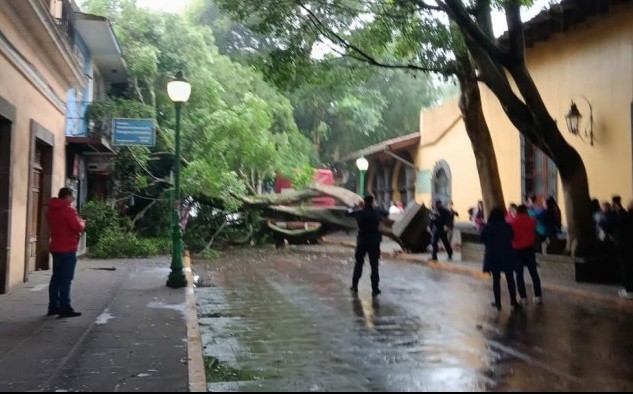 Coatepec, Ver.- (AVC/Verónica Huerta) Un árbol con una altura aproximada a los siete metros se derrumbó en pleno centro de este Pueblo Mágico, en la calle Cuauhtémoc atrás de la iglesia católica San Jerónimo, en la mañana de este martes 07 de enero. De acuerdo con relatos de testigos, un autobús con pasajeros pudo quedarse atrapado bajo el árbol, sin embargo por espacios de segundos el vehículo automotor pasó y luego cayó. La circulación en el centro de Coatepec se encuentra interrumpida en la mañana de este martes 7 de enero; a lugar arribó una patrulla de la policía municipal para acordonar la zona. Posterior llegaron empleados del ayuntamiento de Coatepec con el objetivo de cortar el árbol y empezar a hacer pedazos que permitan moverlo, debido a que por su tamaño no es posible retirarlo en una sola pieza. Aunque no hay un reporte oficial de las autoridades del ayuntamiento de Coatepec que informen las causas que generaron la caída del árbol, por el estado de Veracruz cruza el frente frío número 21 y su masa ártica cubre todo el Golfo de México. Al caer árbol, quedó atravesado en la calle Cuauhtémoc y sus ramas caen sobre la acera de enfrente y cubre algunos negocios; hasta el momento no se reportan personas lesionadas.