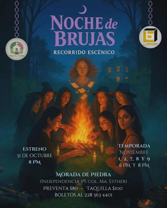 Xalapa, Ver.- Este 31 de octubre el Colectivo Teatral Los Escondidos estrena Noche de Brujas, un recorrido escénico inmersivo que invita al público a adentrarse en el misterio, la memoria y la magia ancestral. La obra transforma la Morada de Piedra en una casa encantada por presencias femeninas que invocan su historia entre fuego, canto y sombras. Durante el recorrido, el público se convierte en parte del ritual: entra en la casa del aquelarre, participa en sus rituales y elige su propio camino. En cada estación descubrirá fragmentos de un hechizo —una historia, una confesión, un conjuro— que conducen al Juicio del Libro de los Nombres, donde las y los espectadores decidirán el destino de las brujas. "Noche de Brujas es una experiencia de conexión con la magia propia, un encuentro entre teatro, rito y memoria; una forma de reconocer la fuerza y sabiduría que sobrevive en las mujeres”, comparte su directora Dalia R. de Leo. En escena: Jennifer Vázquez, Crista Domínguez, Gloria Flores, Frida Nohelani, Kay Aguilar, Obed Hernández Herberth, Alexey Fortunato, Néstor Cano Ríos, Axel J. Ronzón Conde, Aravinda, Dalia R. de Leo y Nayani Castañeda. Noche de Brujas es una invitación a cruzar el velo entre vivos y muertos, a celebrar la memoria y la fuerza del aquelarre. ¡No te lo pierdas! Las funciones de estreno son este jueves 31 de octubre a las 20 horas y 1, 2, 7, 8 y 9 de noviembre a las 18 y 20 horas, con duración de 90 minutos aproximadamente en La Morada de Piedra, calle Independencia #9, Colonia Centro de Xalapa, Veracruz. Preventa de boletos 80 pesos y Taquilla 100, con cupo limitado. Informes y reservas: 228 363 4401