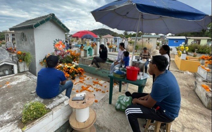 Todo el panteón Xalapeño es un ir y venir de personas que llegan a limpiar la tumba de sus muertos este domingo 2 de noviembre, mientras que Austin David permanece quieto junto a su hermano, con una mesa, una sombrilla tipo parasol, y unas ollas con comida.