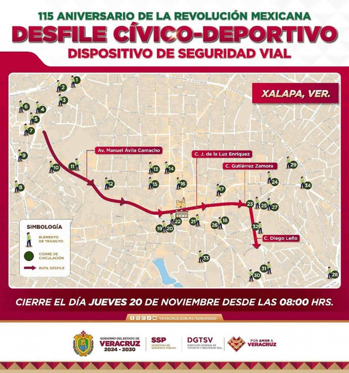 Xalapa, ver.- (AVC) La Secretaría de Seguridad Pública difundió el dispositivo vial para el desfile del 20 de noviembre en Xalapa, con cierres desde las 08:00 horas y una nueva ruta que recorrerá diversas calles del centro de la ciudad.