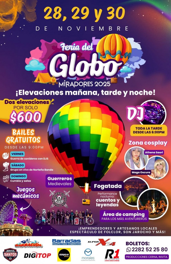 Emiliano Zapata, Ver.- La comunidad de Miradores del Mar tiene el gusto de invitar a todas las familias de la región a la Feria del Globo 2025, que se celebrará este viernes 28, sábado 29 y domingo 30 de noviembre en la hermosa y tranquila Laguna de Miradores, un entorno privilegiado, pintoresco y muy cercano a Xalapa. Este año, la feria será realmente espectacular, con actividades para todas las edades y un ambiente seguro que ha caracterizado a todas las ediciones anteriores. Además, contaremos con eventos musicales gratuitos en cada una de las tres noches, pensados para el disfrute de todos los visitantes: Viernes 28 – Baile Gratuito de Norteño Banda Presentación estelar del sensacional grupo Los del Reino, en una noche llena de energía y ambiente festivo, ideal para inaugurar la feria por todo lo alto. Sábado 29 – Música en vivo Gran noche con grupo de Norteño Banda y un ambiente familiar que hará vibrar el recinto. Domingo 30 – Cierre espectacular A partir de las 9:00 p. m., disfrutaremos de un concierto extraordinario con: Las Águilas del Trópico, regresando con fuerza tras su gira por Centroamérica. Yerba Santa, un grupo fabuloso que pondrá el toque final perfecto con su ritmo y energía. Asimismo, recalcamos con orgullo que la entrada al recinto federal será completamente gratuita, haciendo posible que todas las familias puedan disfrutar plenamente del evento. Miradores del Mar vuelve a destacar como un lugar seguro, ordenado, sin problemas de estacionamiento, con un clima ideal y un ambiente plenamente familiar. Cada año recibimos miles de visitantes sin incidentes, lo que reafirma la tranquilidad y la buena organización de esta feria. Artesanía, gastronomía y emprendimiento Como es tradición, contaremos con un corredor artesanal lleno de talento local: artesanos que sorprenden con sus creaciones únicas y de gran calidad. A ello se suma un corredor gastronómico muy importante, donde la magia del sabor vuelve a sorprender con platillos variados y deliciosos. Todo esto contribuye a una derrama económica muy significativa. Con una afluencia estimada de 25.000 a 30.000 visitantes, se benefician comerciantes, emprendedores, artesanos y establecimientos locales, que ven incrementadas sus ventas gracias a la gran movilización de visitantes durante estos días. Actividades especiales para toda la familia Juegos mecánicos a precios muy accesibles Fogatas y área de camping para los amantes de la naturaleza Cuentos y leyendas gratuitos Recorridos nocturnos alrededor de la laguna para quienes disfrutan de experiencias mágicas y la atmósfera del entorno natural La Feria Miradores del Mar 2025 será una celebración sin igual: llena de color, música, cultura, convivencia, seguridad y oportunidades para todos. Los invitamos a vivir un fin de semana inolvidable en uno de los rincones más especiales de la región. ¡Los esperamos con alegría y los brazos abiertos!