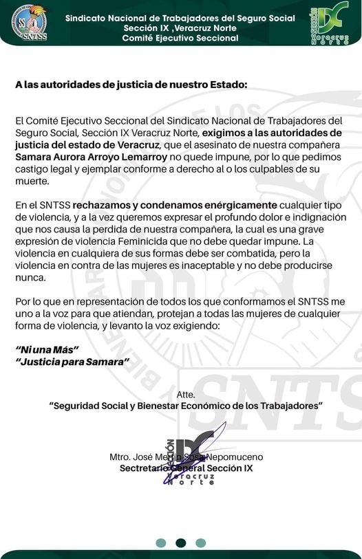 Xalapa, Ver.- (AVC) Luego del asesinato de Samara Aurora Arroyo Lemarroy, una joven nutriologa quien fue asesinada por su instructor de gimnasio, trabajadores del Sindicato de Trabajadores de Salud de la delegación norte de Veracruz exigieron justicia. “ Ni una más” “ Justicia para Samara”, exigieron en un pocisionamiento en redes sociales. A continuación el pronunciamiento completo. El Comité Ejecutivo Seccional del Sindicato Nacional de Trabajadores del Seguro Social, Sección IX Veracruz Norte, exigimos a las autoridades de justicia del estado de Veracruz, que el asesinato de nuestra compañera Samara Aurora Arroyo Lemarroy no quede impune, por lo que pedimos castigo legal y ejemplar conforme a derecho al o los culpables de su muerte. En el SNTSS rechazamos y condenamos enérgicamente cualquier tipo de violencia, y a la vez queremos expresar el profundo dolor e indignación que nos causa la perdida de nuestra compañera, la cual es una grave expresión de violencia Feminicida que no debe quedar impune. La violencia en cualquiera de sus formas debe ser combatida, pero la violencia en contra de las mujeres es inaceptable y no debe producirse nunca. Por lo que en representación de todos los que conformamos el SNTSS me uno a la voz para que atiendan, protejan a todas las mujeres de cualquier forma de violencia, y levanto la voz exigiendo: “Ni una Más” “Justicia para Samara”