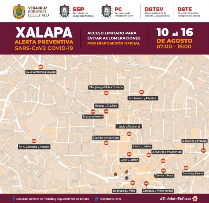 Xalapa, Ver. (AVC/Perla Sandoval) Derivado de las medidas extraordinarias ordenadas por el Gobierno de Veracruz ante el crecimiento inusual de los casos de covid-19, en Xalapa se aplicaron 16 cortes a la circulación que va hacia el centro de la ciudad. Como parte de las medidas para disminuir los contagios, la Dirección General de Tránsito instaló estos cierres en calles altamente transitadas y estará vigente del 10 al 16 de agosto. El acceso limitado para evitar aglomeraciones generó cortes a la circulación en la siguientes vialidades: Corte en la avenida Manuel Ávila Camacho esquina Sayago, lo mismo en la esquina que hace con la calle Victoria. En Clavijero hay corte en la esquina con Melchor Ocampo, así como con Sayago y Altamirano; en Sayago y Azueta hay otro corte a la circulación; en Francisco y Madero esquina Libertad; además en Rafael Lucio esquina Tamborrel, Lucio y Juárez. Lo mismo aplica para las esquinas entre Clavijero y Altamirano; Alfaro y Juárez; en la esquina entre Xalapeños Ilustres e Insurgentes, así como esquina con Arteaga El acceso limitado también incluye a Zaragoza en sus esquinas con Leandro Valle y Primo Verdad; Zamora esquina con Mata y Rojano.