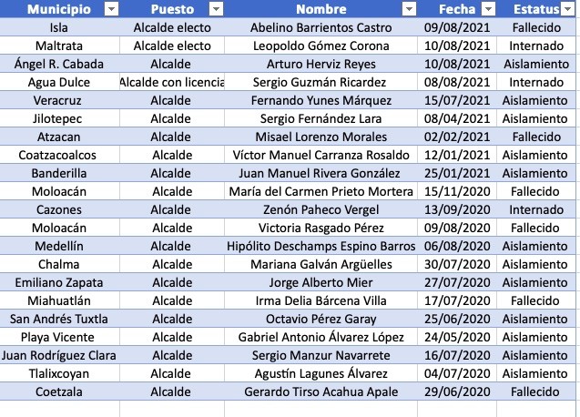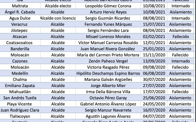 2021-08-12.- En Veracruz al menos 21 presidentes municipales en funciones y electos, contrajeron covid-19, 6 de ellos fallecieron a causa de complicaciones * Este año se reportan 9 alcaldes y alcaldesas que dieron positivo a la enfermedad, 2 de ellos fallecieron.