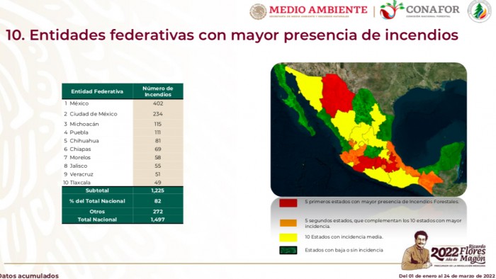 Xalapa, Ver. (AVC/Perla Sandoval) Veracruz se ubica en el noveno lugar entre los estados con más reportes de incendios forestales de enero a marzo de este año, reportó la Comisión Nacional Forestal (Conafor). En el informe semanal —con corte al 24 de marzo— la Conafor señala que en lo que va de este año en Veracruz se han registrado 51 incendios con una afectación de 123.8 hectáreas, de las cuales casi el 80 por ciento es de tipo arbustivo. Esta cifra representa el 32 por ciento del total de los 158 incendios reportados en 2021. En la estadística se advierte que durante todo el 2021 en Veracruz ocurrieron 158 incendios forestales que afectaron a 2 mil 693.8 hectáreas, lo que superó a las cifra de 2020, que registró 120 incendios con 3 mil 253 hectáreas afectadas. A nivel nacional en el periodo que se indica se han registrado mil 497 incendios forestales en 32 entidades federativas, con una superficie afectada de 39 mil 829.44 hectáreas. Cabe destacar que las entidades con más incendios son el estado de México, Ciudad de México, Michoacán, Puebla, Chihuahua, Chiapas, Morelos, Jalisco, Veracruz y Tlaxcala, que representan el 82 por ciento del total nacional. En el caso del Estado de México se han registrado 402 incendios; le sigue Ciudad de México con 234, Michoacán con 115, Puebla con 111, Chihuahua con 81, Chiapas 69, Morelos con 58, Jalisco con 55, Veracruz con 51 y Tlaxcala con 49. Del total de la superficie afectada, el 97.47 por ciento correspondió a vegetación en los estratos herbáceo y arbustivo y el 2.53 por ciento a arbóreo. Por superficie afectada son Campeche, Chiapas, Sonora, Durango, México, Chihuahua, Oaxaca, Puebla, Zacatecas y Michoacán, las que más daño reportan ya que representan el 84.79 por ciento del total nacional.