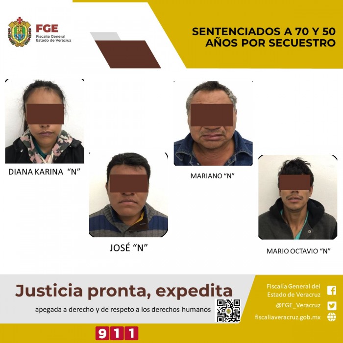 XALAPA, Ver; 6 de junio 2022.- La Unidad Especializada en Combate al Secuestro obtuvo de un Juez sentencia condenatoria de 50 y 70 años de prisión en contra de cuatro personas señaladas del delito de secuestro. A Mario Octavio “N”, José “N”, Mariano “N” y Diana Karina “N” se les relaciona con hechos ocurridos el pasado 1 de enero del año 2018 cuando privaron de la libertad a la víctima, de identidad reservada, cuando salía de su domicilio ubicado en la colonia Centro de la ciudad de Misantla, para posteriormente exigir el pago de dos millones de pesos y una camioneta a cambio de su liberación. El juez dictó sentencia condenatoria de 50 años de prisión en contra de Mario Octavio “N”, José “N” y Mariano “N”, y de 70 años de prisión en contra de Diana Karina “N” así como el pago por la reparación del daño a favor de la víctima, hechos asentados dentro del Juicio Oral J-04/2020.