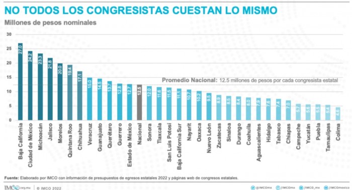 Xalapa, Ver.- (AVC(Perla Sandoval) Cada diputado del Congreso de Veracruz “cuesta” a la población 15 millones de pesos anuales, cifra que posiciona a los legisladores veracruzanos como los octavos más caros en el país, según el informe “Congresos ricos, auditorías pobres” elaborado por el Instituto Mexicano para la Competitividad (IMCO) La cifra contrasta con los recursos destinados para la fiscalización del uso de los recursos públicos. El Poder Legislativo de Veracruz destina solo 23 pesos por habitante para labores de auditoría de los recursos. Esto quiere decir que se invierten aproximadamente 184 millones de pesos del presupuesto del Congreso —que es 747 millones 611 mil pesos— para tales tareas. “Los congresos que no son vigilados pueden ignorar sus responsabilidades y volverse cómplices de malas administraciones”, señala el informe. El estudio detalla que en promedio a nivel nacional cada diputado tiene un costo para la población de 12.5 millones de pesos, pero los de Veracruz se ubican en el lugar ocho a nivel nacional entre los más caros. En primer lugar están los legisladores de Baja California que representan un gasto individual de 27 millones de pesos; luego los de la ciudad de México con 24.2 millones de pesos; los de Michoacán con 23.3 millones de pesos. En cuarto lugar aparece Jalisco en donde cada legislador representa una erogación de 21.8 millones de pesos; en quinto Morelia con 20 millones de pesos por diputado; Quintana Roo con 19.4 millones, en séptimo lugar Chihuahua con 17.1 millones y en octavo Veracruz. Sin embargo, al hacer una comparación entre el gasto que representa cada legislador con el monto destinado a la fiscalización de recursos la discrepancia es clara. Para 2022 el presupuesto de los 32 congresos locales asciende a 13 mil 900 millones de pesos, pero solo 5 mil 281 millones de pesos serán destinados a auditoría de los recursos. Entre estados la diferencia de presupuesto destinado a la auditoría es abismal; mientras en Quintana Roo se destinarán 114 pesos por cada habitante para estas tareas, en Veracruz será solo 23 pesos. En segundo lugar entre los estados con más recursos para auditorías está San Luis Potosí con 103 pesos por habitante y luego Zacatecas con 80 pesos. En contraste, en el Estado de México sólo se destinarán 15.7 pesos por habitante a la auditoría, seguido por Morelos (16 pesos) y Veracruz (23 pesos).