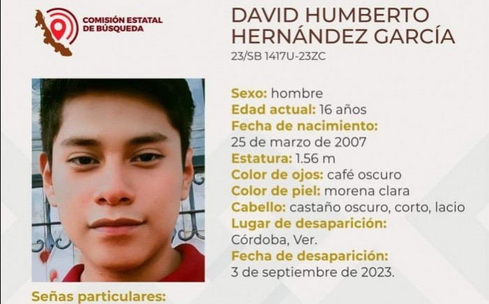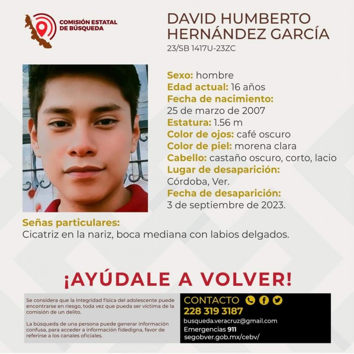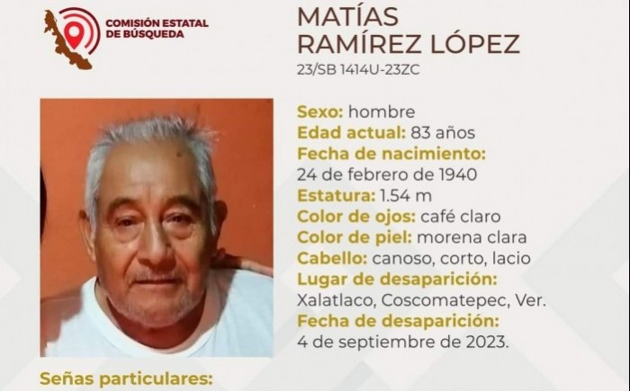 Córdoba, Ver.- (AVC) Luego de que perdieron completa comunicación con sus familias desde el 03 y 04 de Septiembre del presente, la Comisión Estatal de Búsqueda de Veracruz, ha reportado como desaparecidos a dos hombres, entre ellos un menor de 16 años de edad originario de Córdoba y otro de 83 con domicilio en Coscomatepec de Bravo. El adulto mayor Matías Ramírez López de 83 años y con domicilio en Localidad Xalatlaco, municipio de Coscomatepec de Bravo, desapareció el lunes 04 de septiembre, mismo que requiere atención especializada, sordera parcial, lunar al lado izquierdo de la frente y cicatrices en ambas piernas, además de que tiene una estatura de 1.54 metros, ojos café claros, de tez morena clara y con cabello canoso, corto y lacio. El adolescente David Humberto Hernández García de 16 años y con domicilio en Córdoba, desapareció el domingo 03 de septiembre, y tiene una cicatriz en la nariz, boca mediana con labios delgados, además de que tiene una estatura de 1.56 metros, ojos café oscuros, de tez morena clara y con cabello castaño oscuro, corto y lacio. Las familias de ambas personas ya interpusieron una denuncia por desaparición ante la Fiscalía Especializada, además de que solicitaron el inmediato apoyo de la población en general para su pronta ubicación.