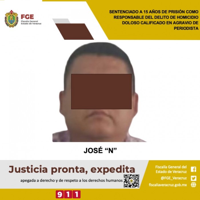 Xalapa, Ver.- La Fiscalía General del Estado, a través de la Fiscalía de Investigaciones Ministeriales, logró sentencia condenatoria de 15 años de prisión en contra de José “N” como responsable del delito de homicidio doloso calificado, cometido en agravio de la periodista María Elena Ferral Hernández. Hechos suscitados el 30 de marzo de 2020 en el municipio de Papantla, cuando participó en los hechos en los que se privó de la vida a la víctima. El juez además de dictar sentencia suspendió sus derechos civiles y políticos, dentro del proceso penal J-27/2023.