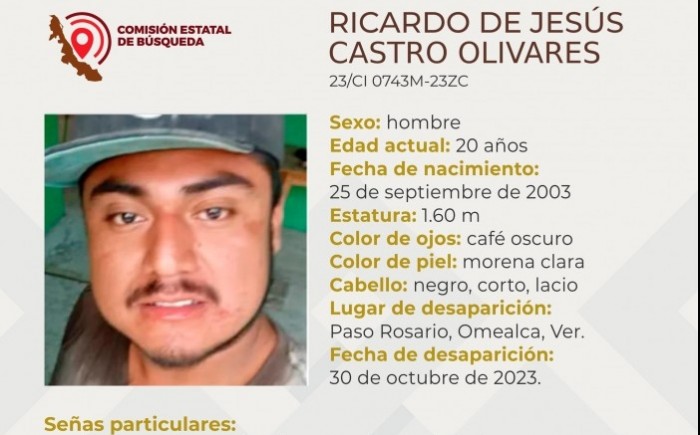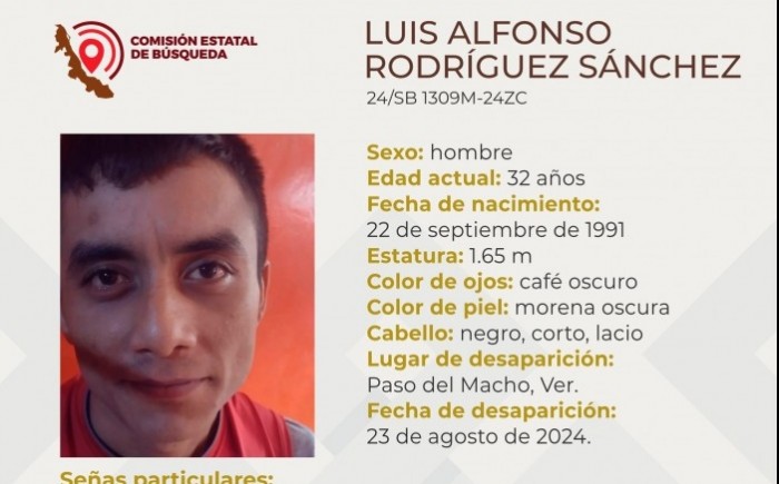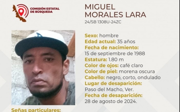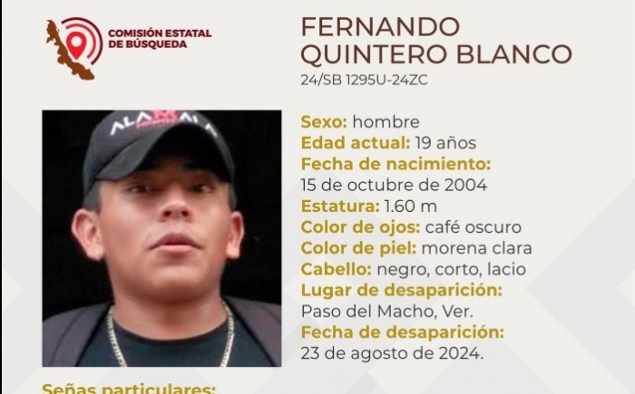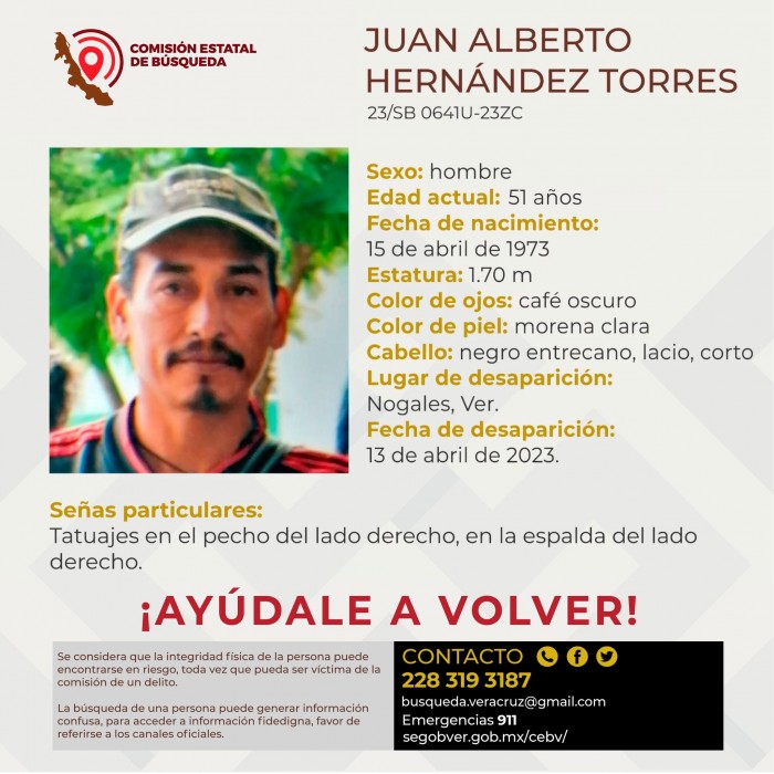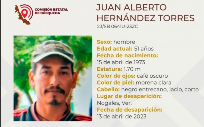Xalapa, Ver.- (AVC) La Comisión Estatal de Búsqueda del estado de Veracruz (CEB) reportó la desaparición de cinco personas en distintos municipios de la entidad veracruzana y solicita el apoyo de la población para su pronta localización. La ficha 23/SB 0641U-23ZC reporta la desaparición de Juan Alberto Hernández Torres, de 51 años de edad, con quien se perdió el contacto el pasado 13 de abril de 2023 en Nogales, Veracruz. La ficha 23/CI 0743M-23ZC reporta la desaparición de Ricardo de Jesús Castro Olivares, de 20 años de edad, con quien se perdió el contacto el pasado 30 de octubre de 2023 en Paso Rosario, Omealca, Veracruz. La ficha 24/SB 1295U-24ZC reporta la desaparición de Fernando Quintero Blanco, de 19 años de edad, con quien se perdió el contacto el pasado 23 de agosto de 2024 en Paso del Macho, Veracruz. La ficha 24/SB 1308U-24ZC reporta la desaparición de Miguel Morales Lara, de 35 años de edad, con quien se perdió el contacto el pasado 28 de agosto de 2024 en Paso del Macho, Veracruz. La ficha 24/SB 1309M-24ZC reporta la desaparición de Luis Alfonso Rodríguez Sánchez, de 32 años de edad, con quien se perdió el contacto el pasado 23 de agosto de 2024 en Paso del Macho, Veracruz.