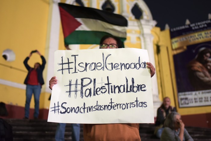 En Xalapa, más de un centenar de personas se manifestaron la noche de este miércoles en la Plaza Regina, convocadas por el Frente Xalapa x Palestina. Durante el mitin, un integrante del Frente expresó, en referencia a la reciente declaración de la presidenta Claudia Sheinbaum, que “no basta con decir que es un genocidio si no hacemos nada al respecto”. En consecuencia, exigieron al gobierno mexicano romper relaciones diplomáticas y comerciales con Israel, además de brindar apoyo inmediato a las y los mexicanos que viajan en la flotilla.