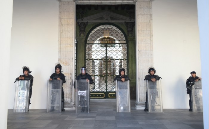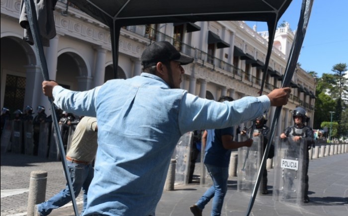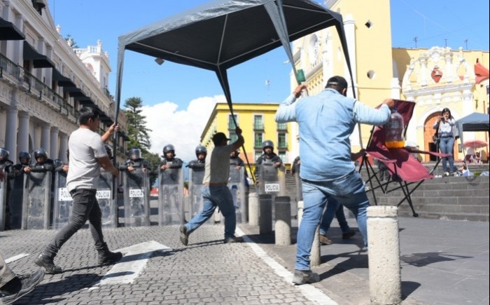 Poco antes de las 10:00 horas, más de 20 policías con escudos y toletes avanzaron sobre la vialidad y se apostaron frente al campamento de los manifestantes, en su mayoría adultos mayores.