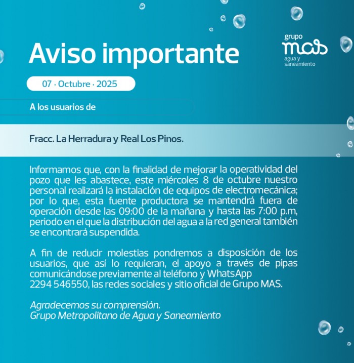 Veracruz, Ver. (AVC) El Grupo Metropolitano de Agua y Saneamiento (MAS) informó que este miércoles 8 de octubre se realizará la instalación de equipos electromecánicos en el pozo que abastece a los fraccionamientos La Herradura y Real Los Pinos, por lo que el suministro de agua será suspendido de 9:00 a.m. a 7:00 p.m. La empresa señaló que los trabajos tienen como objetivo mejorar la operatividad del pozo y garantizar un servicio más eficiente para los usuarios. Durante el horario de intervención, la fuente productora permanecerá fuera de operación y no habrá distribución hacia la red general. Grupo MAS indicó que, para reducir las afectaciones, se brindará apoyo mediante pipas de agua a quienes lo soliciten. Los usuarios podrán comunicarse al teléfono y WhatsApp 2294 546550, así como a través de las redes sociales y el sitio oficial de la empresa. La empresa pidió la comprensión de los habitantes de ambos fraccionamientos durante las horas de suspensión del servicio y reiteró su compromiso de mantener una red hídrica en óptimas condiciones.