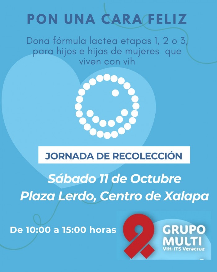Xalapa, Ver. (AVC).– Este sábado 11 de octubre, el Grupo Multisectorial VIH-ITS Veracruz realizará la jornada “Pon una cara feliz”, una campaña de recolección de fórmula láctea para hijos e hijas de mujeres que viven con VIH. La actividad se llevará a cabo de 10:00 a 15:00 horas en Plaza Lerdo, en el centro de Xalapa. Se invita a la ciudadanía a donar fórmula láctea etapas 1, 2 o 3, que será entregada a madres que, por razones médicas, no pueden amamantar a sus bebés. El Grupo Multisectorial VIH-ITS Veracruz recordó que la lactancia no está recomendada para mujeres que viven con VIH, por lo que la fórmula láctea es esencial para garantizar la nutrición y desarrollo de sus hijos e hijas. Con esta jornada, la organización busca sensibilizar sobre la importancia del apoyo comunitario y la no discriminación hacia las mujeres que enfrentan esta condición.