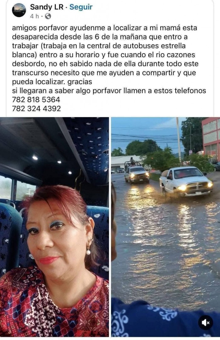 Amigos por favor ayuden a localizar a mi mamá esta desaparecida desde las 06:00 de la mañana del viernes que entró a trabajar (trabaja en la Central de Autobuses Estrella Blanca) entró a su horario y fue cuando el rio Cazones se desbordó, no he sabido nada de ella durante todo este transcurso del día, necesito que me ayuden a compartir y que pueda localizarla, gracias.