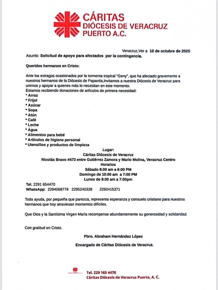 Veracruz, Ver.- (AVC/José Juan García) El vocero de la diócesis de Veracruz, Aurelio Mojica Limón, dio a conocer que el temporal lluvioso y el desbordamiento de ríos en la zona norte del estado provocaron daños y pérdidas materiales en templos católicos de las diócesis de Tuxpan y Papantla. En entrevista, Mojica Limón aclaró que todavía no se tiene el número de templos católicos afectados, pero sí hay reportes de pérdidas de prendas y cosas litúrgicas, equipos de sonido, muebles, entre otras cosas. “Una cantidad determinada así, no, han mandado algunos videos, algunas fotografías, de cómo quedaron algunos templos, algunas capillas, destruidas y que hubo bastante pérdida material, también ha habido pérdida de vidas humanas, eso no debemos de olvidarlo, en esta zona de Puebla, de Hidalgo, del norte del estado, que es lo más afectado”, agregó. Por otra parte, el presbítero dijo que se habilitó un centro de acopio en las instalaciones de Cáritas de la Diócesis de Veracruz Puerto con la finalidad de reunir víveres que se enviarán a las diócesis de Tuxpan y Papantla para apoyar a las familias damnificadas. De acuerdo con Cáritas de la Diócesis de Veracruz Puerto, se puede donar lo siguiente: arroz, frijol. Azúcar, sopa, atún, café, leche, agua, alimentos para bebé, artículos de higiene personal y utensilios y productos de limpieza. Las instalaciones de Cáritas de la Diócesis de Veracruz Puerto se ubican en Bravo, número 473, entre Mario Molina y Zamora, en la zona centro de la ciudad de Veracruz. La entrega se puede realizar en el horario siguiente: lunes de ocho de la mañana a siete de la noche. “Cada parroquia podrá tener su Cáritas parroquial o grupos de Pastoral Social, algunos a lo mejor ya están solicitando esa ayuda, los víveres que de común se piden, a nivel del estado de Veracruz las distintas diócesis, los distintos obispos ya han dado sus mensajes de bendición y oración para todas estas personas de los distintos lugares, como es Poza Rica y otras comunidades que fueron bastante afectadas y que siguen pasando por esta situación crítica”, finalizó el vocero.