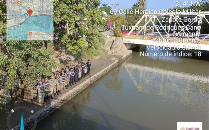 Esta Institución realiza un puntual monitoreo, para lo cual se emplean dos aviones, un helicóptero, dos drones, siete embarcaciones y 10 vehículos de la Armada de México que realizan vuelos de reconocimiento, recorridos marítimos y terrestres en los municipios de mayor riesgo como Álamo y Tuxpan, para dar seguimiento al desplazamiento de hidrocarburos en el río Pantepec mediante observación directa.