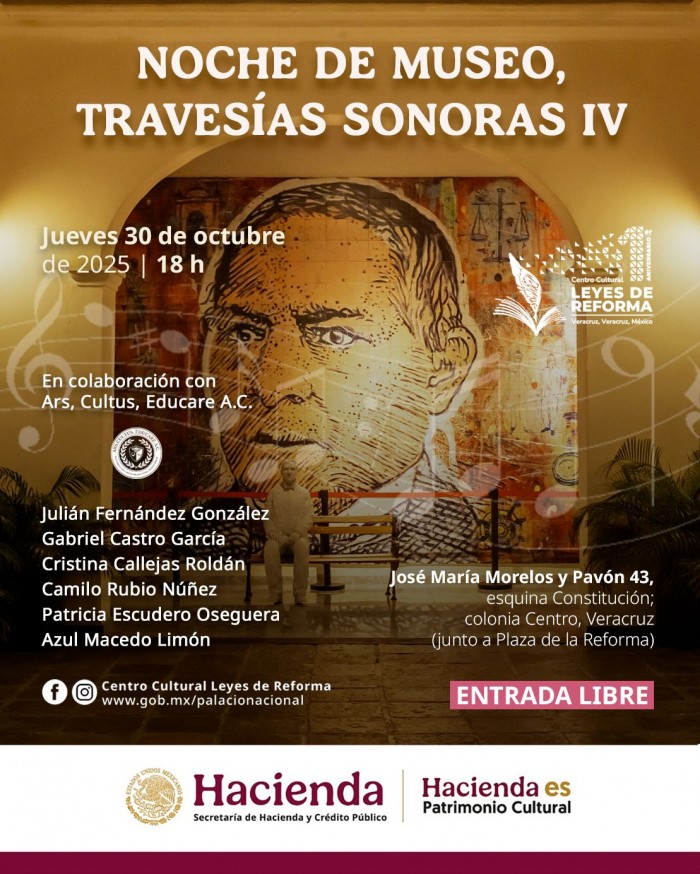 Veracruz, Ver.- El Centro Cultural Leyes de Reforma (CCLR), recinto de la Dirección General de la Conservaduría de Palacio Nacional y Patrimonio Cultural de la Secretaría de Hacienda y Crédito Público (SHCP), invita a una nueva edición de Noche de Museo, en la que se amplía el horario para visitar la exposición Las Leyes de Reforma, escuchar un repertorio musical diferente y conocer propuestas culturales alternativas, el próximo jueves 30 de octubre. A partir de las 17:00 horas, las y los asistentes podrán participar en el taller Cartas para Juárez, conformada por la pieza interactiva del mes. En esta actividad creativa los visitantes han elaborado y depositado en el buzón -con diseño morisco- una postal con sellos y mensajes sobre lo que le preguntarían al presidente Juárez si tuvieran la oportunidad de conocerlo. Esta tarde conoceremos los mensajes que se han escrito. ¡Participa en esta reflexión! A las 18:00 horas, las y los asistentes presenciarán el concierto Travesías Sonoras IV. Dedicado al 340 aniversario del nacimiento de Johann Sebastian Bach, bajo la dirección de la maestra Luisa González Pardo, integrantes de Ars, Cultus, Educare A.C., ofrecerán un homenaje al compositor cuya obra sigue inspirando por su belleza y profundidad. El programa incluirá la colección completa de sus invenciones a dos voces, piezas que reflejan la genialidad, sensibilidad y amor a la música que caracterizaron a Bach. Previamente, a las 13:00 horas, en Plaza de la Reforma, se llevará a cabo la Expo Impulsa Mujer Rural Veracruz, un espacio que busca visibilizar y fortalecer la labor de las trabajadoras veracruzanas dedicadas al emprendimiento, la producción artesanal y la economía social. Esta muestra ofrece una plataforma para la difusión de proyectos productivos y sostenibles que reflejan la riqueza cultural del estado. Durante esta jornada, el Centro Cultural Leyes de Reforma ampliará su horario para que el público pueda recorrer las exposiciones permanentes Las Leyes de Reforma y Las Leyes de Benito. Ésta última, fue inaugurada recientemente y alberga los trabajos del Segundo Concurso de Dibujo y Pintura Infantil y Juvenil. Mediante visitas guiadas se podrá conocer el contexto histórico y social de la época liberal, momento fundamental para la construcción del México moderno. El Centro Cultural Leyes de Reforma reafirma así su compromiso con la promoción del arte, la historia y la participación ciudadana, al abrir sus espacios al talento local y fomentar la convivencia cultural entre públicos de todas las edades. Todas sus actividades son familiares y sin costo.