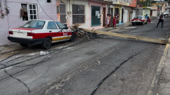 Veracruz, Ver.- (AVC) Las rachas de viento del Norte que se registraron en la ciudad de Veracruz derivado del frente frío número 12 provocaron la caída de dos postes de la Comisión Federal de Electricidad (CFE) en la colonia 21 de abril, dejando sin el servicio eléctrico a familias de la zona. Uno de los postes cayó sobre un taxi que se encontraba estacionado sobre la Calle 2, entre Hernán Cortés y Juan Soto. El poste de concreto provocó daños en el cofre y el parabrisas de la unidad. Afortunadamente ninguna persona se encontraba en el interior del vehículo. De acuerdo con los vecinos, el poste presentaba daños en su estructura, lo cual se reportó a la CFE, pero no se atendió la situación. El otro poste de la CFE cayó en la Calle 2 y Hernán Cortés. Según los vecinos, este poste se cayó alrededor de las ocho de la noche del domingo. Ambos postes se llevaron consigo líneas de televisión por cable, telefonía y de internet. La circulación vial se interrumpió en la zona. Los vecinos de la zona sufrieron la falta de electricidad, televisión por cable, telefonía e internet a consecuencia de la caída de los postes. Cabe mencionar que trabajadores de la CFE acudieron a la colonia 21 de Abril por la mañana de este lunes 3 de noviembre para retirar los postes e iniciar los trabajos para el restablecimiento del servicio eléctrico en la zona.