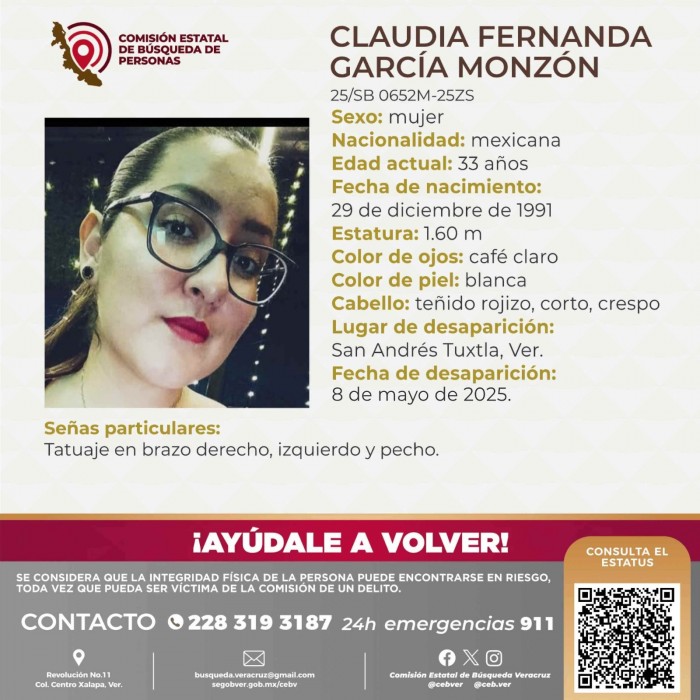 La ficha de la Comisión Estatal de Búsqueda de Claudia Fernanda García Monzón refiere que tiene 33 años de edad; estatura: 1.60 metros; color de ojos: café claro; cabello: teñido rojizo, corto, crespo; color de piel: blanca; señas particulares: tatuajes en brazo derecho, izquierdo y pecho.