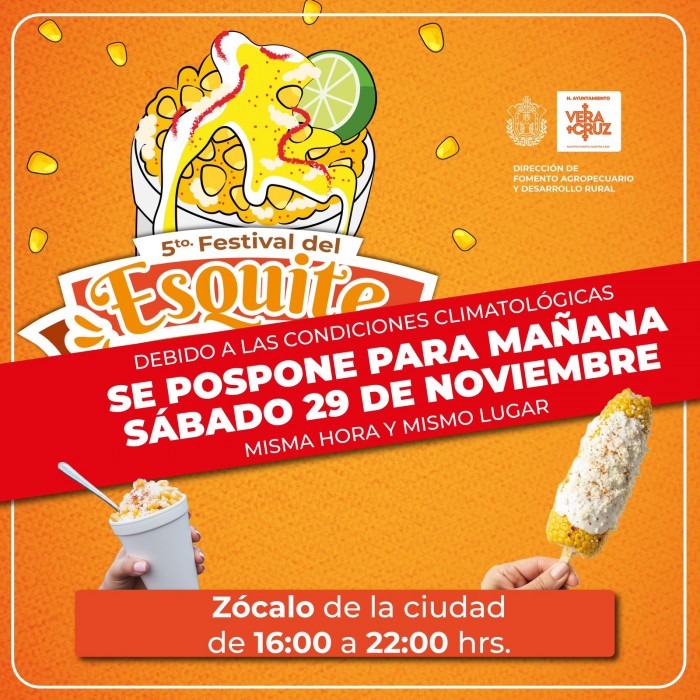 Veracruz, Ver.- (AVC) Las autoridades municipales de Veracruz informaron que el V Festival del Esquite, que tendría lugar este viernes en el zócalo de la ciudad, se reprogramó para este sábado 29 de noviembre en el mismo lugar a partir de las cuatro de la tarde. El festival se reprogramó debido a las condiciones meteorológicas que se registraron en la ciudad este viernes. "Debido a las condiciones climatológicas, el Festival del Esquite se realizará el día de mañana, sábado 29 de noviembre, a partir de las 4 de la tarde en el zócalo de nuestra ciudad", dieron a conocer las autoridades porteñas. De acuerdo a la directora de Fomento Agropecuario y Desarrollo Rural del ayuntamiento de Veracruz, Gisela Castro González, se incrementó el número de expositores que participarán en el V Festival del Esquite que tendrá lugar en el zócalo de esta ciudad. Además, Castro González resaltó que los expositores ofrecerán esquites de camarón, de res, de tuétano, de patitas de pollo, rojo, verde, entre otras formas de elaboración. La funcionaria municipal detalló que los expositores que participarán en el V Festival del Esquite son de la Tejería, Santa Fe, Dos Lomas, Villarín, de los fraccionamientos Geo Los Pinos, Buenavista, El Coyol, la zona centro, entre otros puntos.