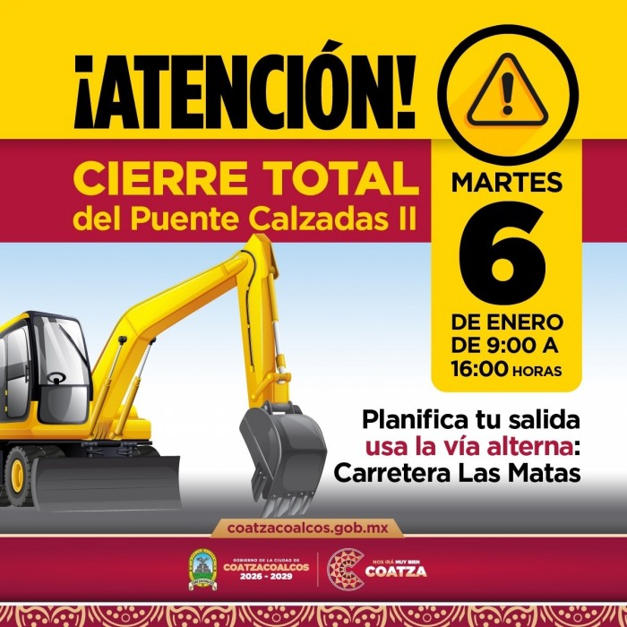 Coatzacoalcos, Ver.- El paso vehicular en el Puente Calzadas II se cerrará este martes 6 de enero, de 9:00 a 16:00 horas, por maniobras de montaje de vigas en el tramo Minatitlán–Canticas–Coatzacoalcos.