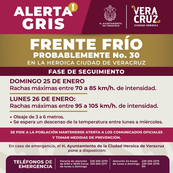 Veracruz, Ver.- (AVC) La Dirección de Protección Civil Municipal de Veracruz informa que se activa la Alerta Gris ante el ingreso del Frente Frío (probable) No. 30, previsto para este domingo, con descenso de temperatura y viento del norte con rachas de 80 a 95 km/h, especialmente durante la noche y madrugada. Se prevé ambiente fresco a frío en la ciudad, con rachas de viento que podrían generar afectaciones al transitar en la vía pública o realizar actividades al aire libre. Se recomienda reducir la exposición al frío, vestir ropa adecuada y proteger a niñas, niños y personas adultas mayores. Además, se aconseja evitar actividades en el mar, asegurar objetos que puedan ser desplazados por el viento y estar atentos a cualquier cambio en las condiciones meteorológicas. En caso de emergencia, comunicarse a: 📞 Atención lunes a domingo de 8:00 a 18:00 horas: • 229 200 2270 • 229 200 2271 📞 Atención 24 horas: • 229 200 2275 • 229 200 2276 🚨 Emergencias: • 911