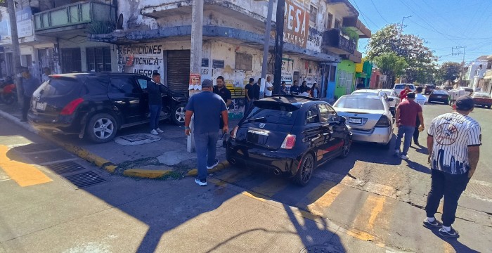 Veracruz, Ver.- (AVC/José Juan García) Un percance vial suscitado en la zona centro de la ciudad de Veracruz involucró a cinco vehículos que registraron daños materiales. El percance vial se registró en el cruce de Allende y Velázquez de la Cadena luego de que un conductor de una camioneta Nissan Murano, con placas YJE-143-B del estado, supuestamente no respetara la preferencia vial, el chofer de un auto Abarth trató de esquivarla, pero se impactó a la altura de su puerta delantera. Ambas unidades salieron proyectadas, la camioneta se impactó contra un local en desuso y el vehículo contra unos automóviles que estaban estacionados sobre Velázquez de la Cadena. Debido al impacto, se activaron las bolsas de aire del Abarth y su conductor resultó con golpes en una mano y en una pantorrilla. El Abarth chocó contra un Honda, éste golpeó a un Dodge Attitude y finalmente éste contra un Nissan Versa. Cabe mencionar que peritos de la Dirección de Tránsito y Vialidad del ayuntamiento de Veracruz se trasladaron al lugar del percance para tomar conocimiento de los hechos y determinar el deslinde de responsabilidades.