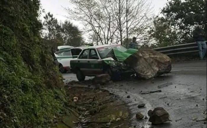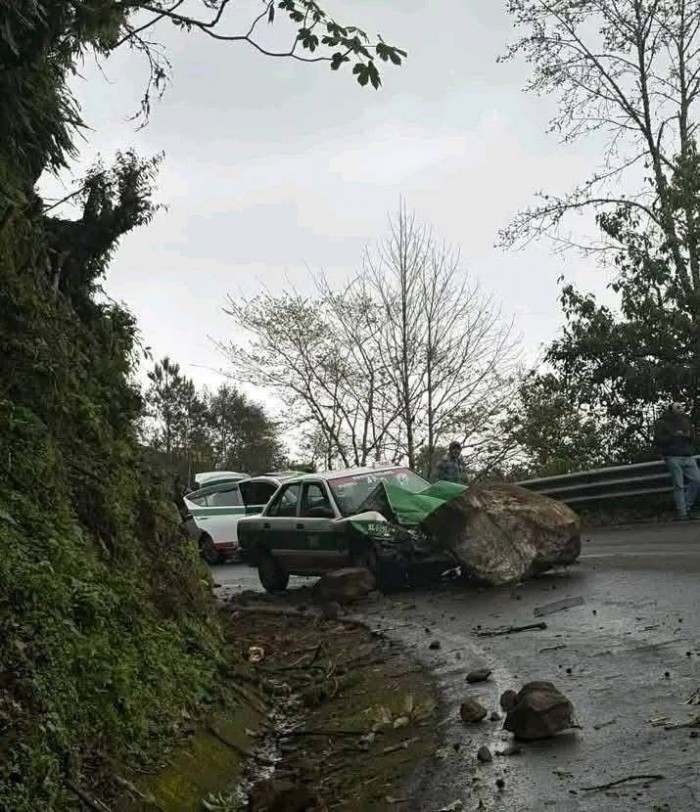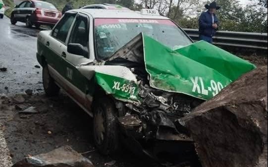 Misantla, Ver.- (AVC/Verónica Huerta) Un taxi de Xalapa se impactó contra una roca desprendida sobre la carretera estatal Xalapa–Misantla, a la altura de El Mirador, la tarde del jueves 5 de febrero de 2026. No se reportaron personas lesionadas.