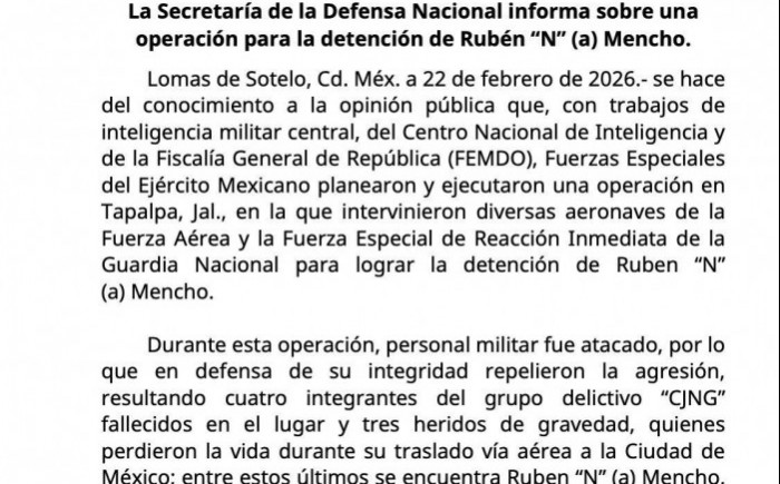Ciudad de México.- (AVC) La Secretaría de la Defensa Nacional (Sedena) informó sobre un operativo realizado en Tapalpa, Jalisco, con el objetivo de detener a Rubén “N”, alias “El Mencho”, señalado como presunto líder del Cártel Jalisco Nueva Generación (CJNG).