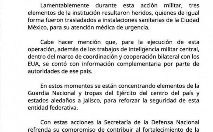 De acuerdo con el Comunicado de Prensa No. 03, fechado el 22 de febrero de 2026, la acción derivó de trabajos de inteligencia militar central, en coordinación con el Centro Nacional de Inteligencia y la Fiscalía General de la República (FEMDO). En el despliegue participaron Fuerzas Especiales del Ejército Mexicano, aeronaves de la Fuerza Aérea y la Fuerza Especial de Reacción Inmediata de la Guardia Nacional.