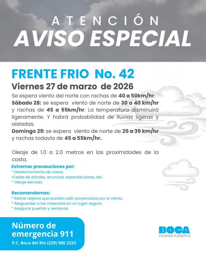 Boca del Río, Ver.- ( AVC) La presidenta municipal de Boca del Río, Maryjose Gamboa Torales, a través de la Dirección de Protección Civil Municipal de Boca del Río, comunica que el gobierno municipal se pone en alerta por los efectos que se puedan presentar ante el ingreso del frente frío número 42. De acuerdo con los pronósticos oficiales, se esperan cambios en el estado del tiempo; el sábado 28 de marzo se espera el incremento en el potencial de lluvia aisladas en la región, además de viento del cuadrante Norte con velocidades de entre 45 y 55 kilómetros por hora. Además, se espera el incremento del oleaje en la franja de costa, por ello los elementos guardavidas estarán pendientes e informando a los ciudadanos sobre las condiciones de ingreso o no al mar. En tanto, para el día domingo, se prevé que el viento disminuya de manera gradual, así como la presencia de lluvia en Boca del Río. La autoridad municipal exhorta a la población a mantenerse informada a través de los canales oficiales y tomar las precauciones necesarias. Asimismo, recuerda que, para cualquier emergencia, se encuentran disponibles los números de atención 911, así como los teléfonos de Protección Civil de Boca del Río: (229) 986 23 23.