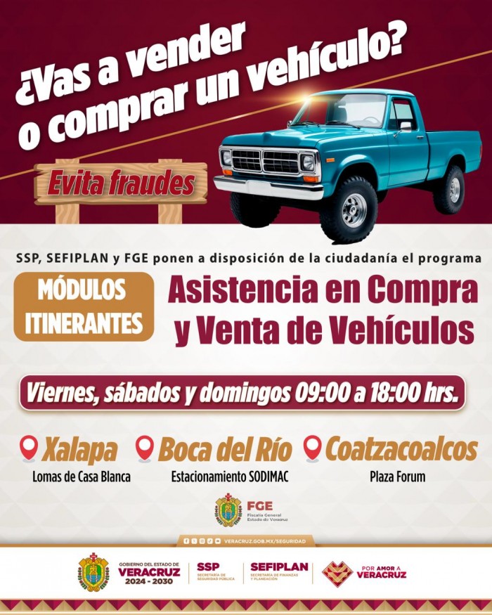 Xalapa, Ver. (AVC).— Comprar o vender un vehículo sin verificación previa puede derivar en fraude, robo o problemas legales, por lo que autoridades en Veracruz implementaron un programa para ayudar a la ciudadanía a realizar transacciones seguras