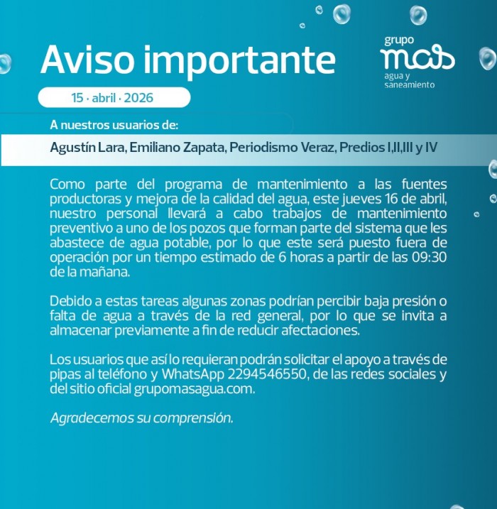 De acuerdo con el aviso, el mantenimiento se realizará en uno de los pozos que abastecen estas áreas, el cual será puesto fuera de operación por aproximadamente 6 horas, a partir de las 09:30 horas.