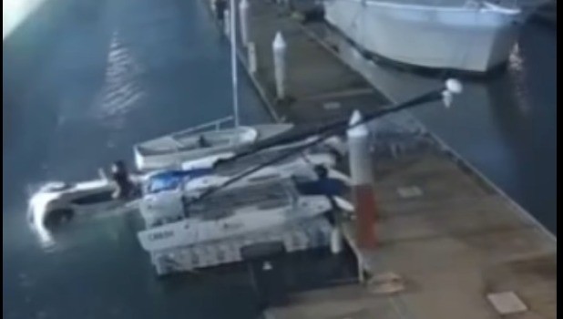 De acuerdo con cámaras de seguridad, la unidad ingresó al área de la marina, impactó contra lanchas y el muelle, y terminó volcada de costado en el canal, muy cerca de varios yates.