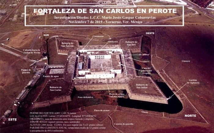 “El fuerte de San Carlos de Perote es un cuadrado fortificado con baluartes no de mucha extensión, pero de la suficiente para llenar bastante bien los objetos que el gobierno se propuso cuando determinó su construcción. Los baluartes son de bastante capacidad, aunque todas sus líneas y también las de defensa me parecieron un poco cortas. No debo omitir a vuestra señoría que este fuerte necesita de una recomposición, que debiera haberse ejecutado hace algunos años, y en este caso su costo no hubiera pasado de cinco a seis mil pesos, pero como no se ha podido hasta ahora ocurrir a esta atención, el deterioro se ha aumentado considerablemente, y juzgo que para remediarlo en el día se necesitan acaso de catorce a quince mil pesos, que podrán aumentarse en razón directa del tiempo que se retarde la citada recomposición. Vuestra señoría sabe que este fuerte está situado en una llanura al norte del Cofre de Perote, y muy inmediata a esta alta montaña.